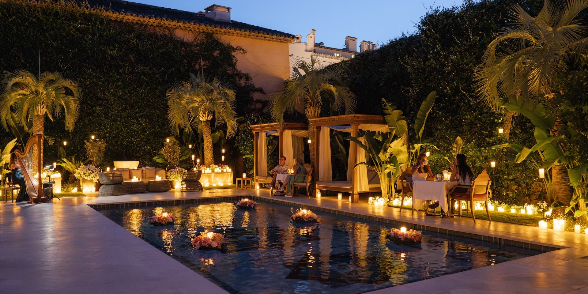 The week culminates in a magical evening of music every Sunday from 7 p.m., when Les Nuits du Pan Deï fills the garden with the magic of candlelight. Delicate floating flames drift on the turquoise pool, and the transportive sound of a live harp brings the week to an idyllic end.