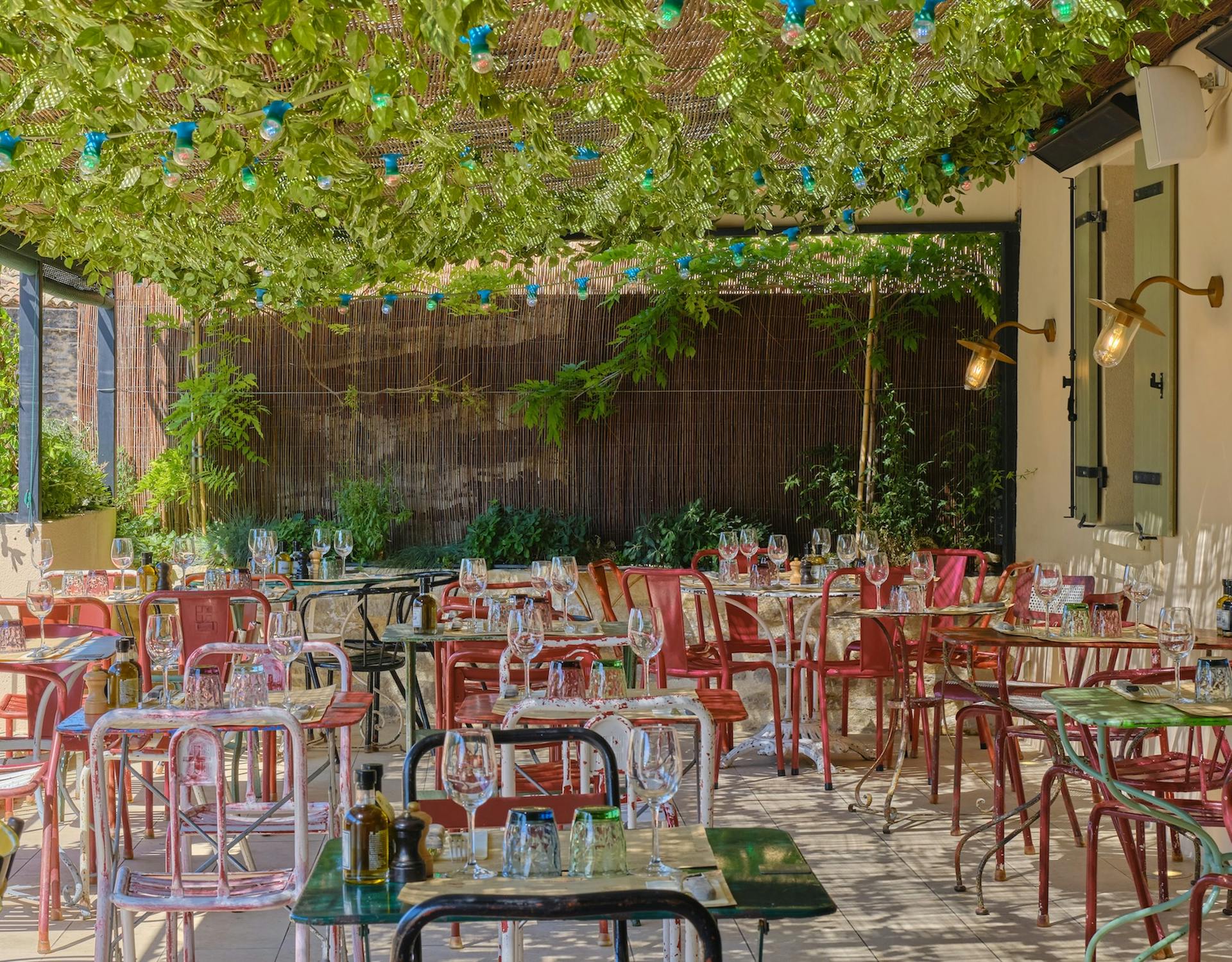 Le soir, La Bastide de Pierres donne à la place du village de Gordes une atmosphère de dolce vita, avec ses jolies guirlandes lumineuses, ses murs ocres et ses plantes grimpantes.
