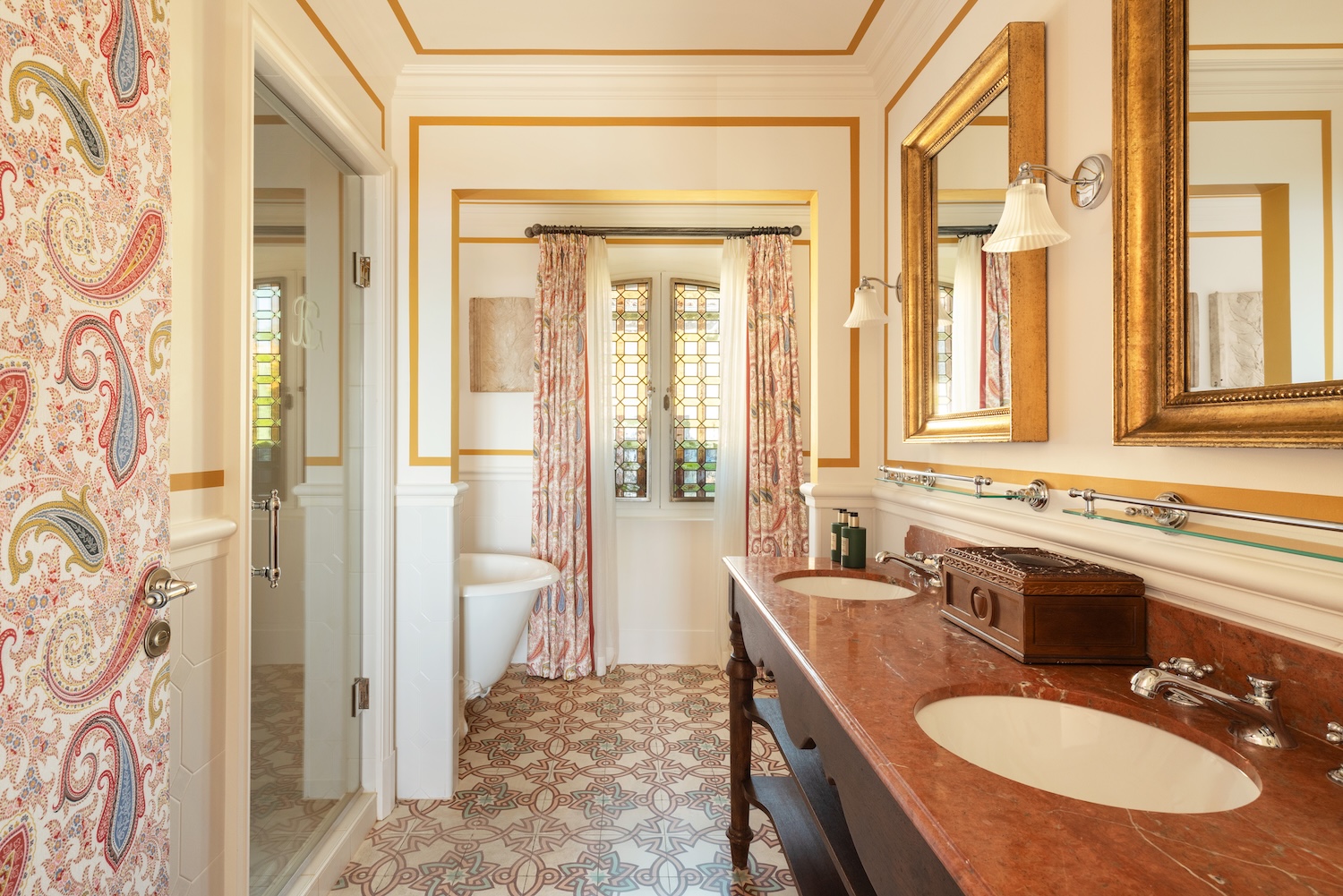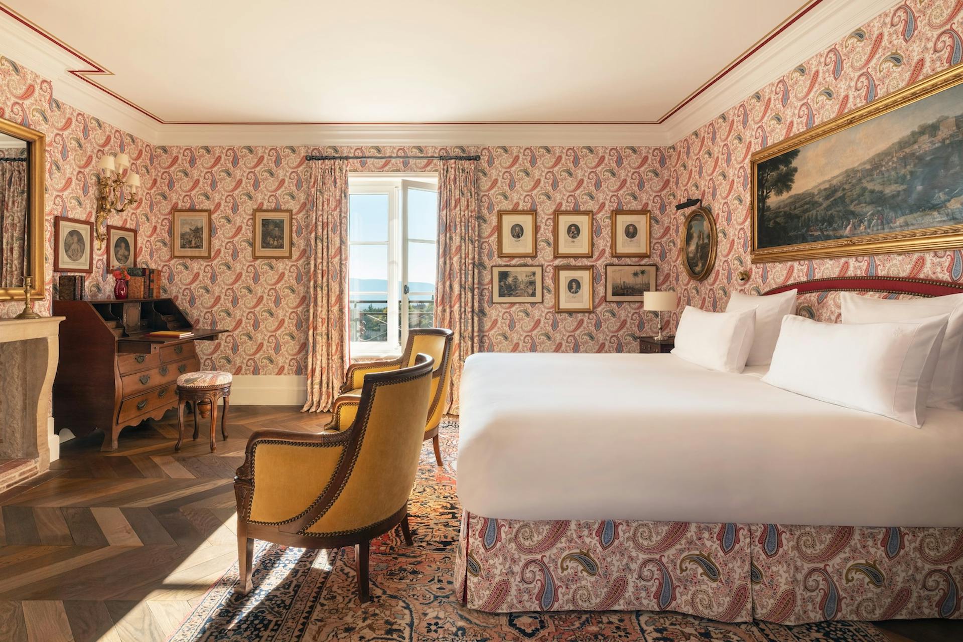 Un espace bureau est élégamment aménagé dans le coin salon de la chambre. Objets d’art et mobiliers d’époque composent cette chambre aux allures de musée. Une plongée dans l’histoire explicitée par les matériaux choisis. En plus d’un spacieux dressing, la chambre dispose d’une salle de bain équipée d’une baignoire ou d’une douche.