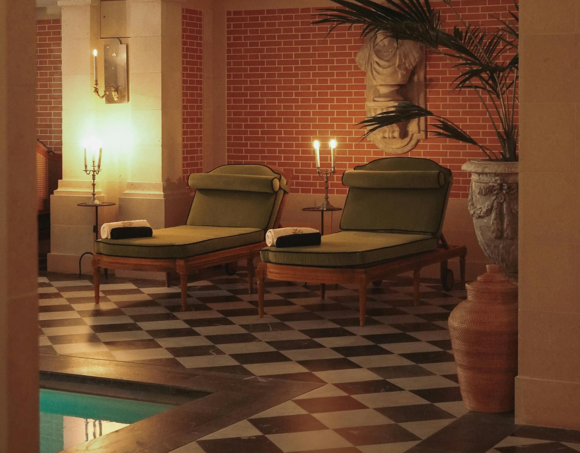 I luccicanti pavimenti a scacchi in marmo di Carrara conducono alla nostra lussuosa sauna e all’hammam, e omaggiano i grandi cortili dell’illustre vicina, la Reggia di Versailles.