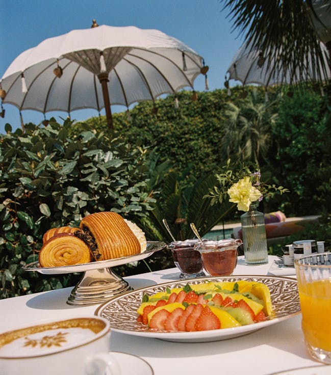 Cambio di scenario: fatevi accompagnare in auto alla nostra spiaggia privata sulla leggendaria Baia di Pampelonne, dove potrete pranzare al ristorante Jardin Tropézina o tuffarvi nelle acque turchesi del Mediterraneo.