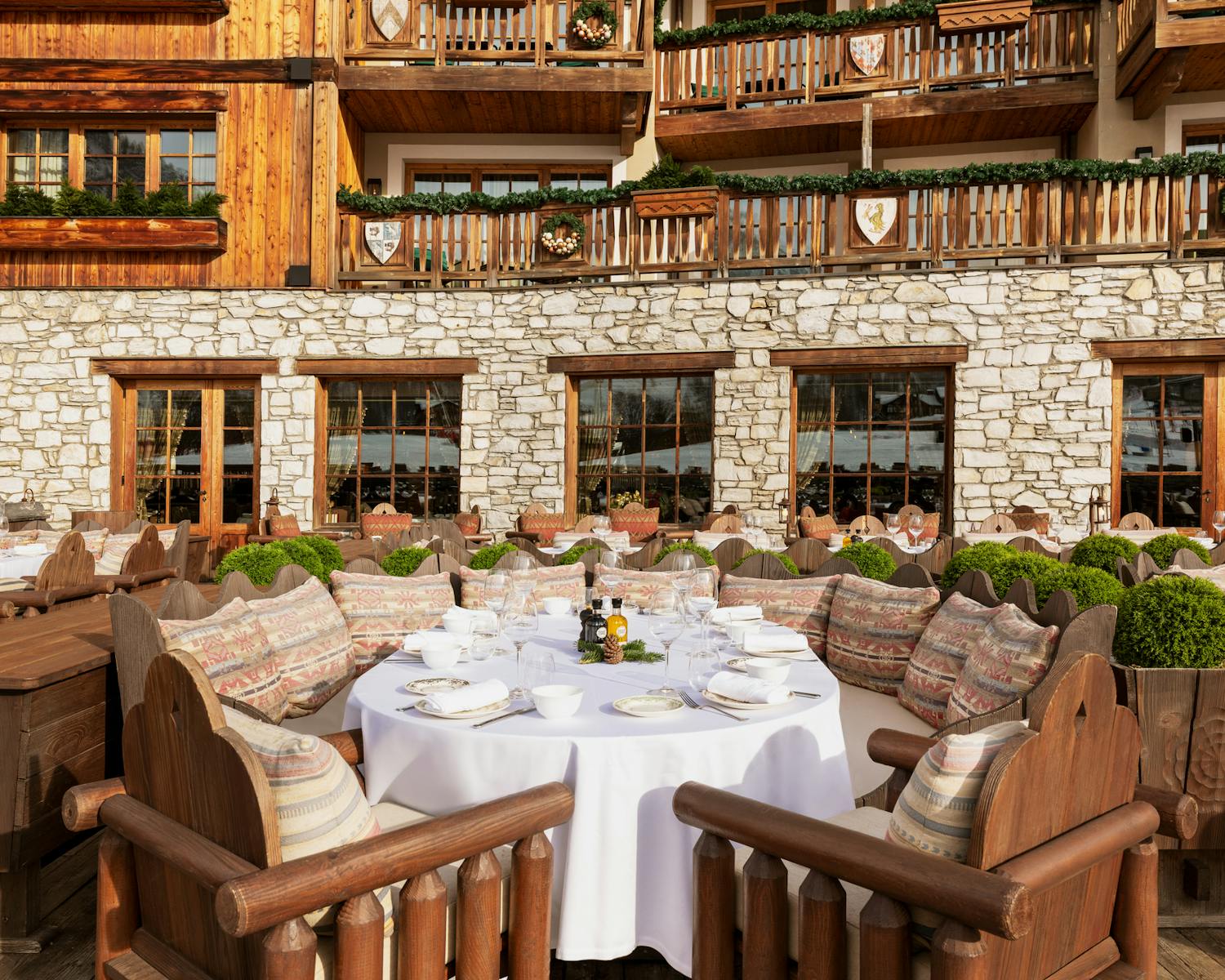 L'interno elegante e confortevole progettato dall'architetto d'interni delle Maison Airelles, Christophe Tollemer, rende omaggio al calore savoiardo attraverso tocchi di legno e tessuti tartan. In cucina, ogni sera prende vita un autentico banchetto italiano, con un menu accuratamente elaborato ispirato ai sapori veneziani, mentre la vasta terrazza esterna è perfetta per pranzi soleggiati, offrendo una vista spettacolare sulle vette della Tarentaise.